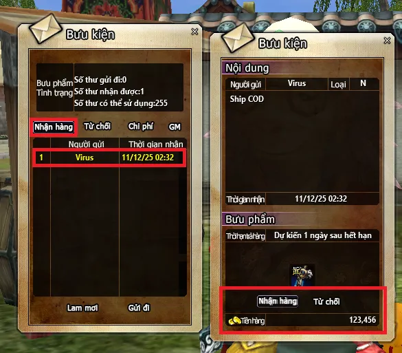 Hệ thống này giúp người chơi có thể gửi vật phẩm cho người khác qua bưu phẩm và có thể yêu cầu một lượng vàng nhất định để nhận hàng.